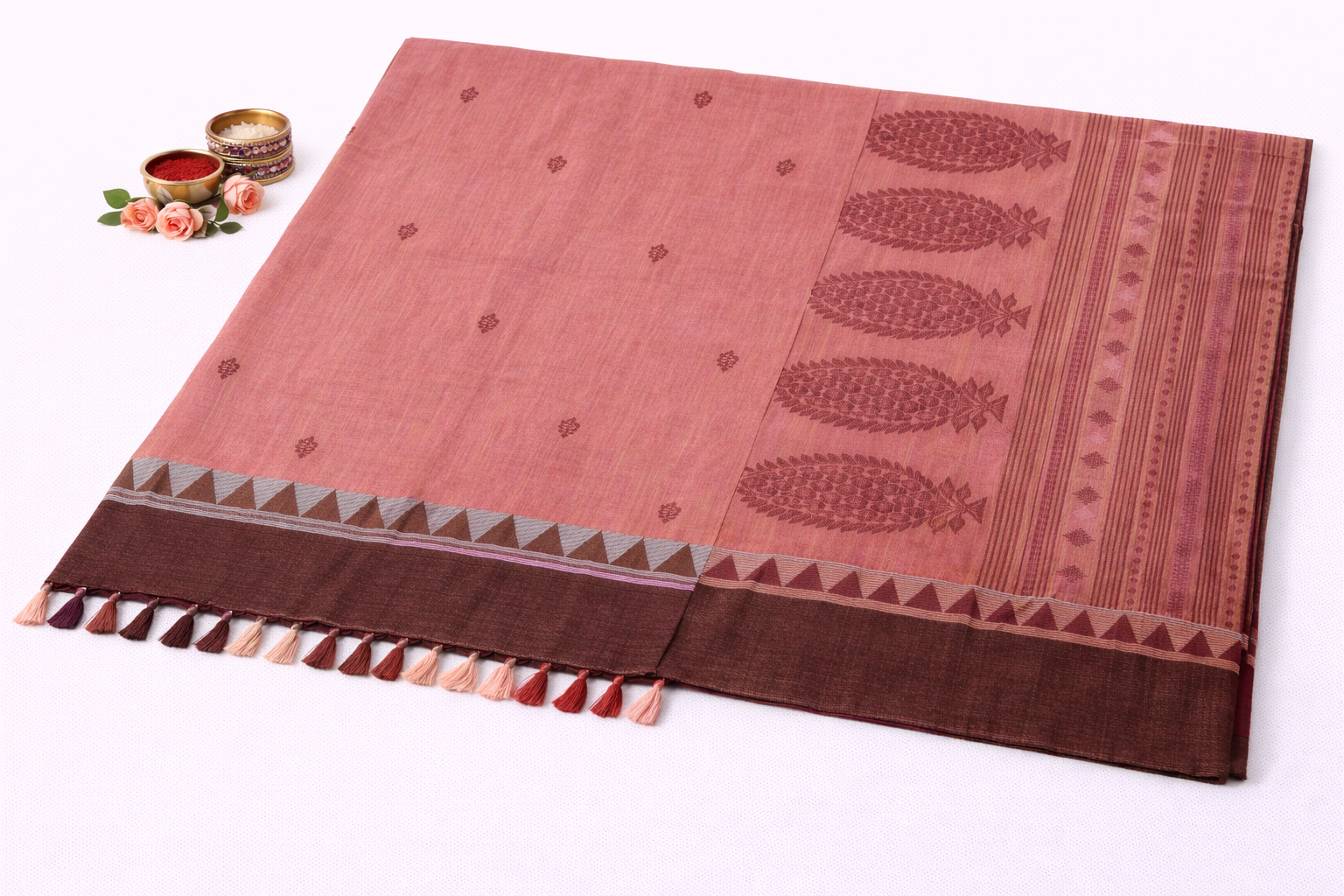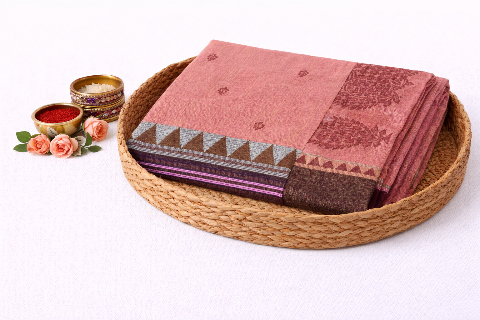 • Design: Traditional woven motifs with contrasting border and pallu