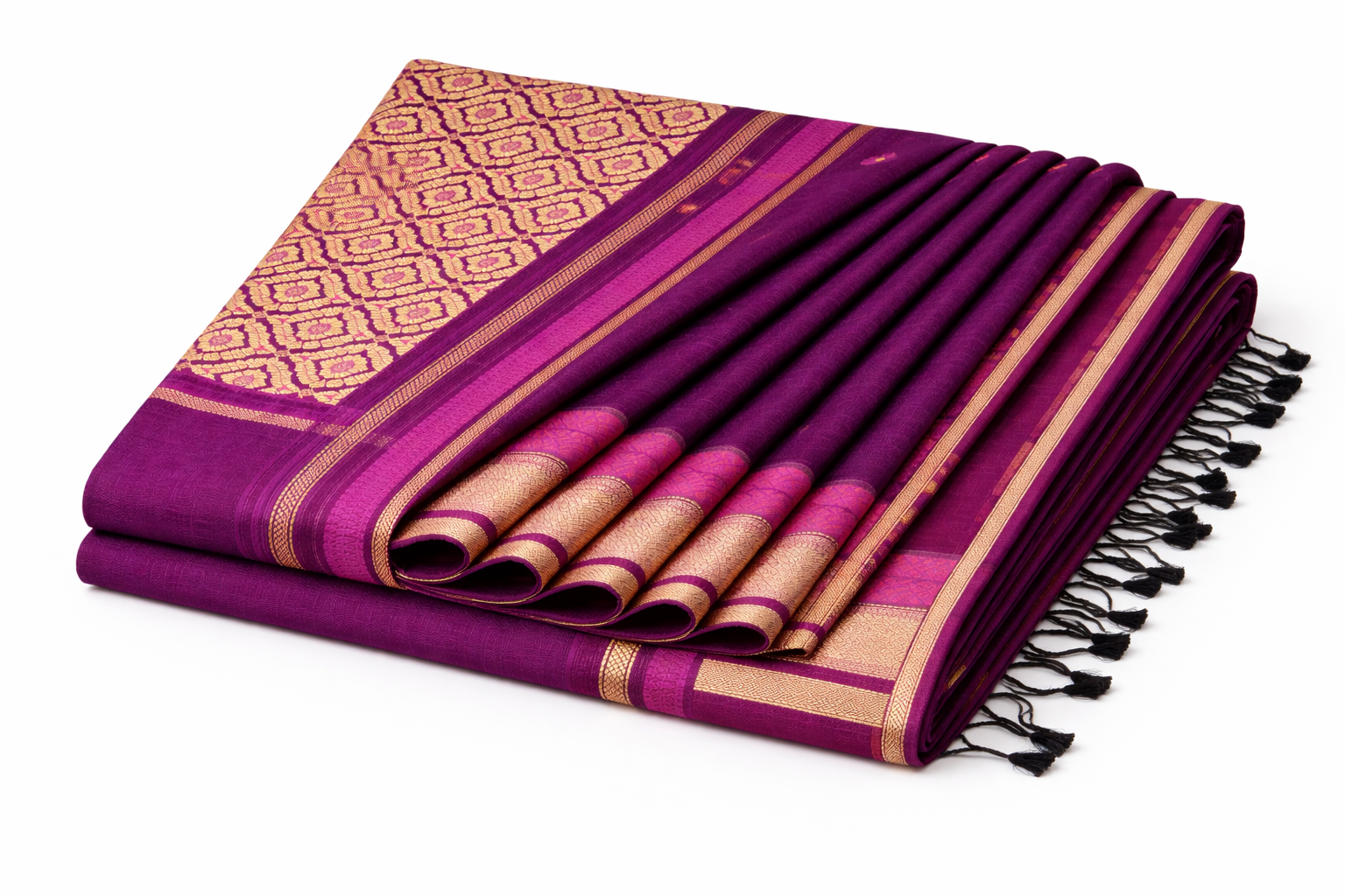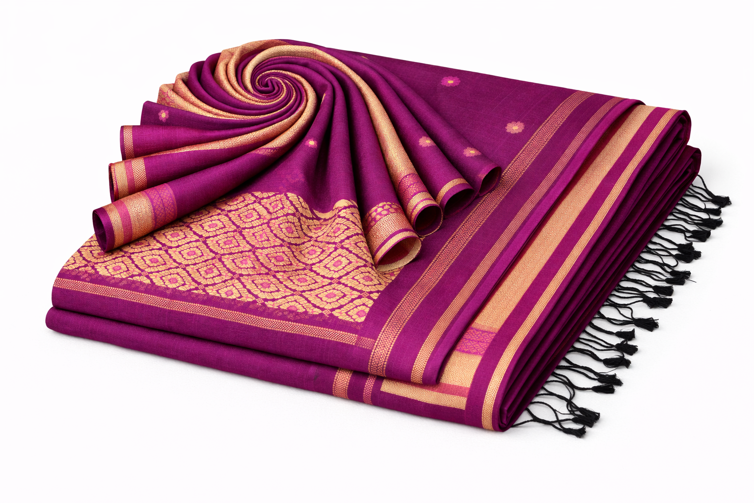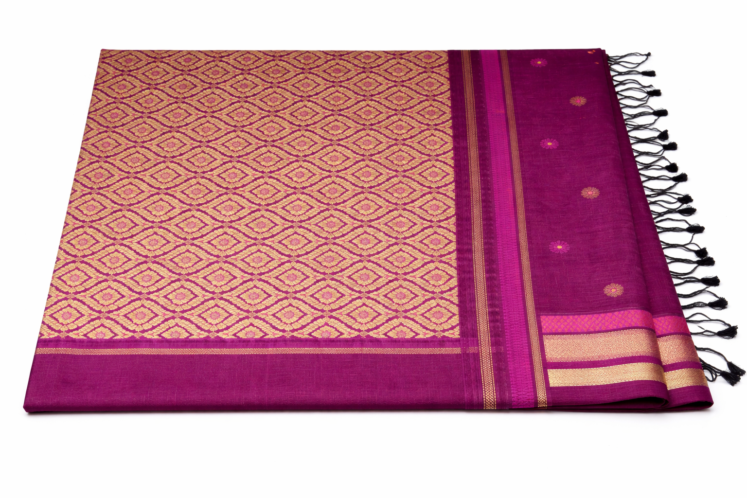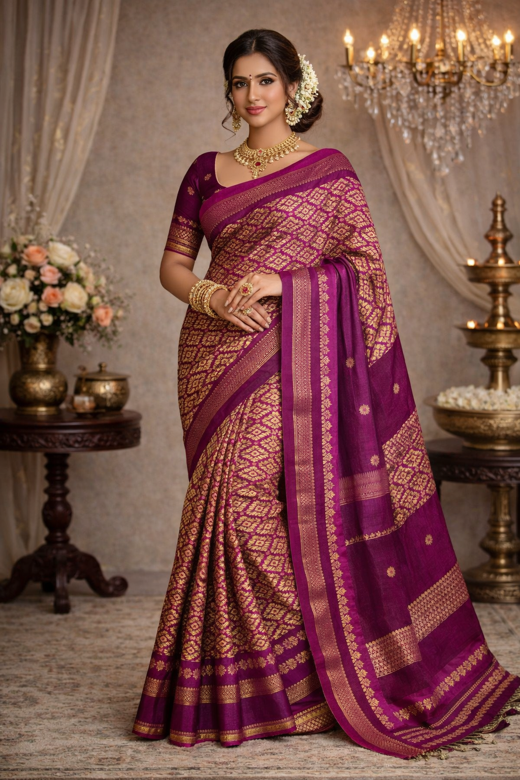 • Design: Traditional woven motifs with elegant border and pallu
