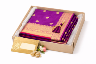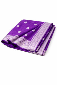 Premium handwoven pure silk saree from Varanasi, designed by a National Award–winning designer. Featuring traditional woven motifs with a rich border and pallu, and certified with Silk Mark and Handloom Mark issued by the Government of India. Suitable for weddings, festive occasions, and formal traditional wear.
